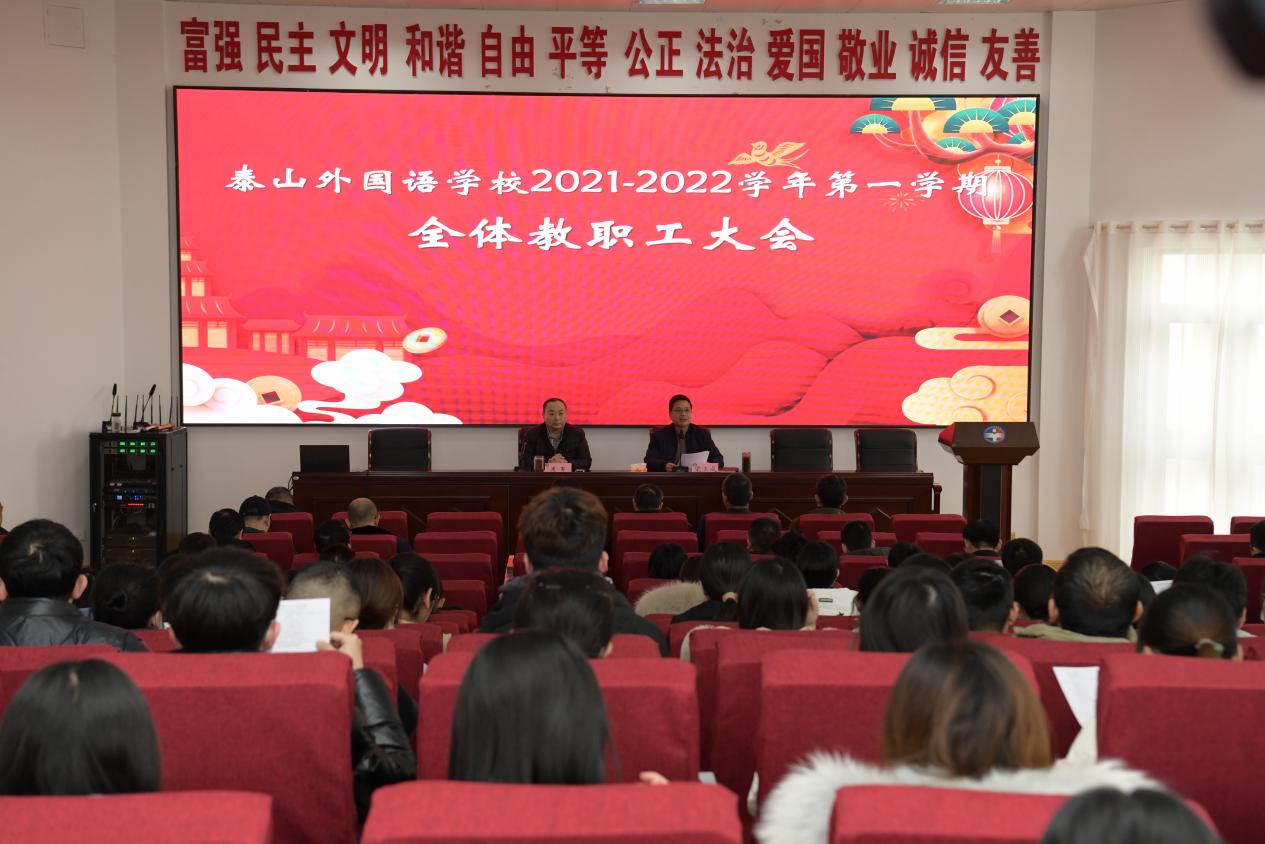 2022年1月21日下午三點,泰山外國語學校2021-2022學年第一學期全體教職工大會在崇遠樓階梯教室隆重召開。參加本次會議的領導有:辦學顧問周軍、宋玉成、黨政辦公室主任徐東高、教務處主任高秀泉、學工處主任王濤、總務處主任曲斌、對外交流中心(培訓處)主任王建中以及各級部主任、全體教職員工。本次會議由副校長宋玉成主持。