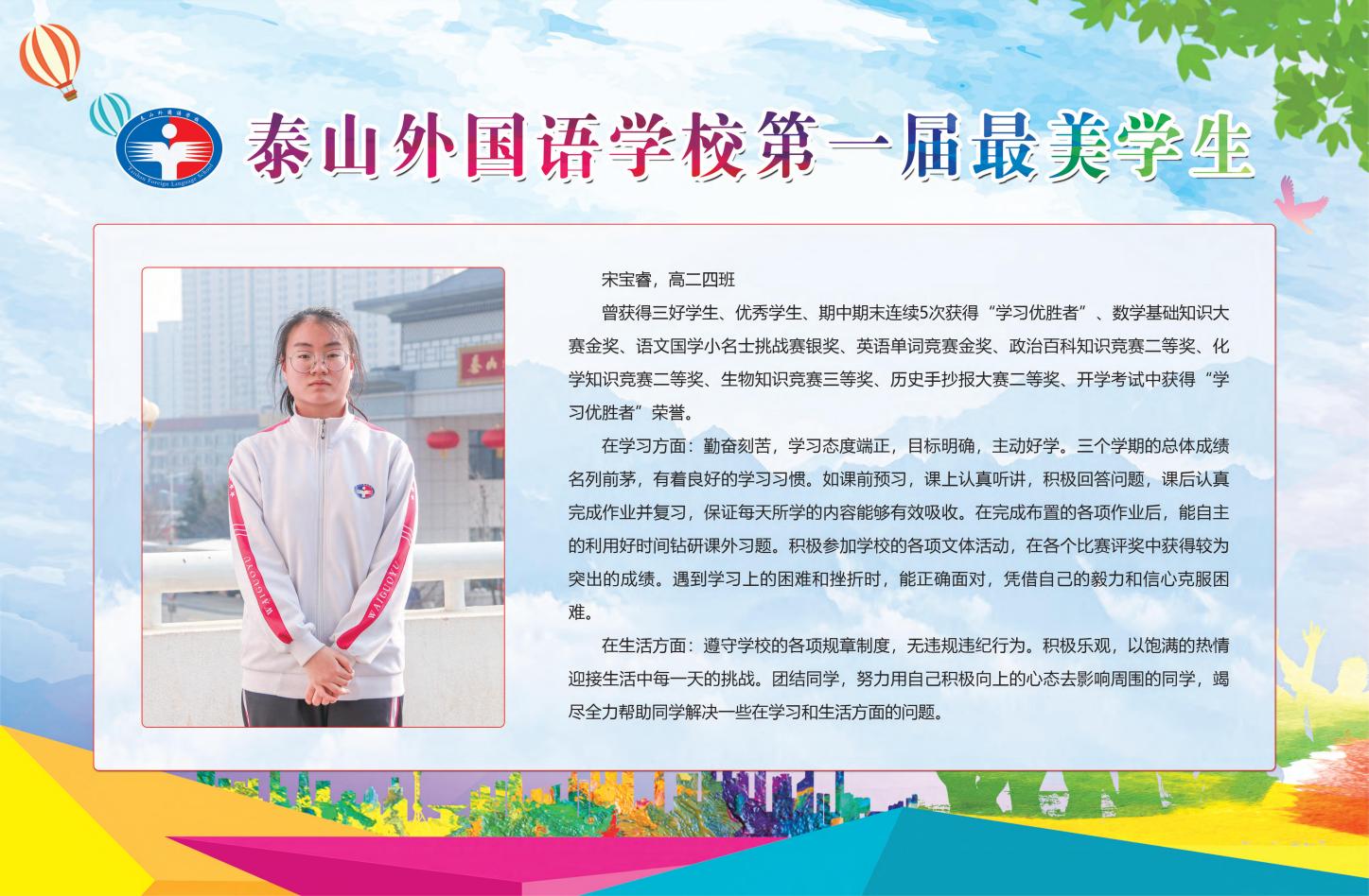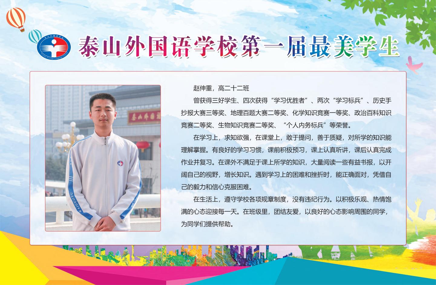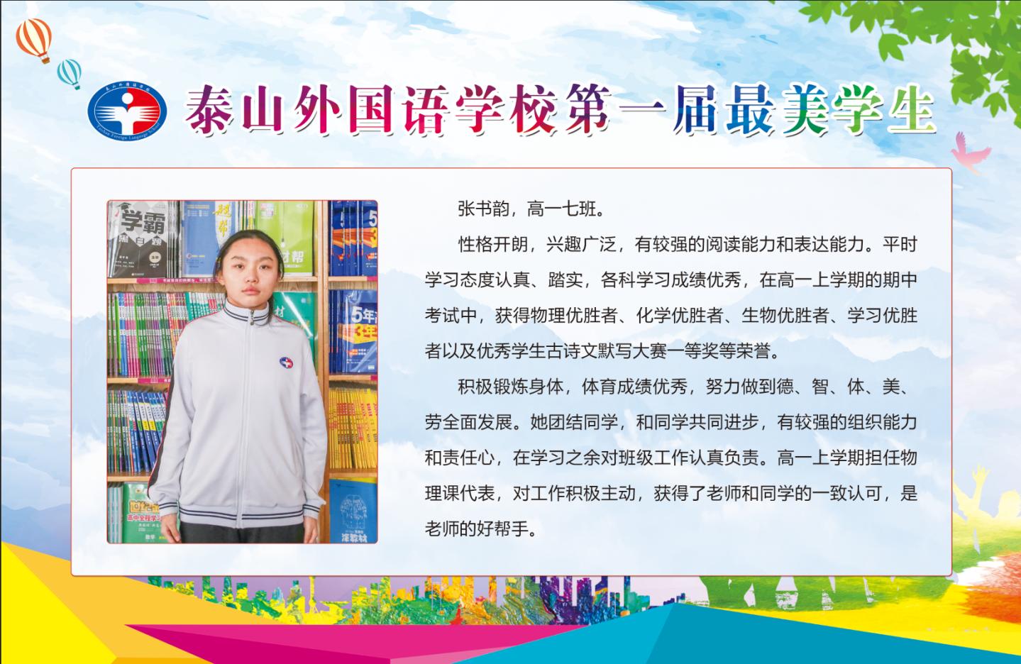 為了全面貫徹黨的教育方針,圍繞“把立德樹人作為教育的根本任務(wù)”的要求,進(jìn)一步落實(shí)《中小學(xué)德育工作指南》的精神,激發(fā)學(xué)生的進(jìn)取心和責(zé)任感,充分展示榜樣的模范力量和模范帶頭作用,努力提高學(xué)校德育工作實(shí)效,培養(yǎng)德智體美勞全面發(fā)展的社會(huì)主義建設(shè)者和接班人,培育具有中華民族傳統(tǒng)與國際開放視野的現(xiàn)代公民,泰山外國語學(xué)校舉行第一屆“最美學(xué)生”評(píng)選活動(dòng)。經(jīng)過班級(jí)投票推薦、級(jí)部審核、學(xué)工處資格審查、推薦學(xué)生演講、評(píng)審組委會(huì)投票、學(xué)校終審及公示等環(huán)節(jié),十名學(xué)生獲得“最美學(xué)生”榮譽(yù)稱號(hào)。他們分別是:
