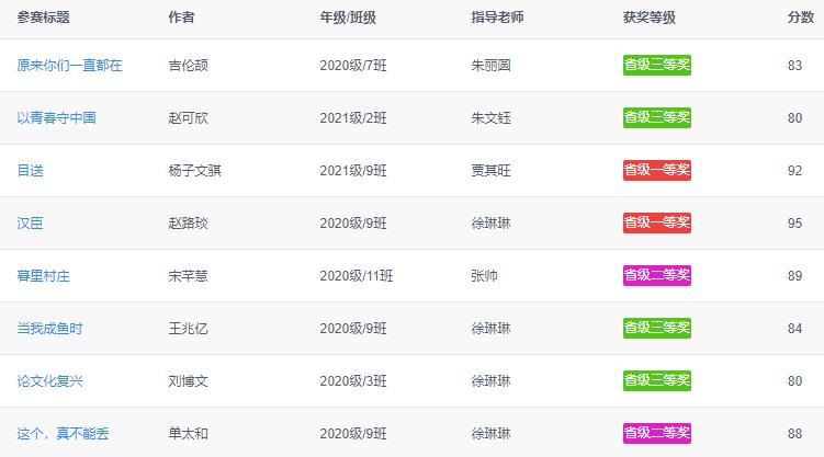 由教育部(教監(jiān)管廳函(2021)7號(hào))批準(zhǔn)舉辦的第十九屆葉圣陶杯全國(guó)中學(xué)生新作文大賽于2021年9月開(kāi)賽。初賽(省級(jí)賽)采用線上投稿的方式,共收到稿件77萬(wàn)余份。經(jīng)學(xué)校初評(píng)推薦、大賽評(píng)委會(huì)復(fù)評(píng)終評(píng),評(píng)獎(jiǎng)結(jié)果已揭曉,熱烈祝賀我校8名學(xué)生突破重圍,取得省級(jí)一二三等獎(jiǎng)的優(yōu)異成績(jī)。更加可喜可賀的是,2020級(jí)9班的趙路琰同學(xué)憑借《漢臣》這篇文章獲得95分的高分,成功晉級(jí)全國(guó)總決賽!