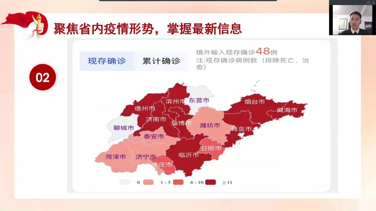 會(huì)議伊始,于帥老師用最新數(shù)據(jù)、圖表介紹了山東省內(nèi)及泰安市最新疫情防控信息。