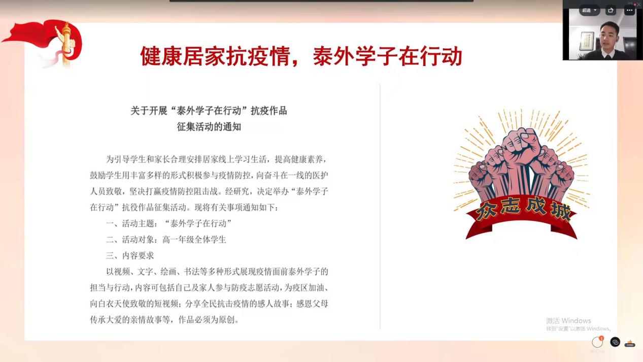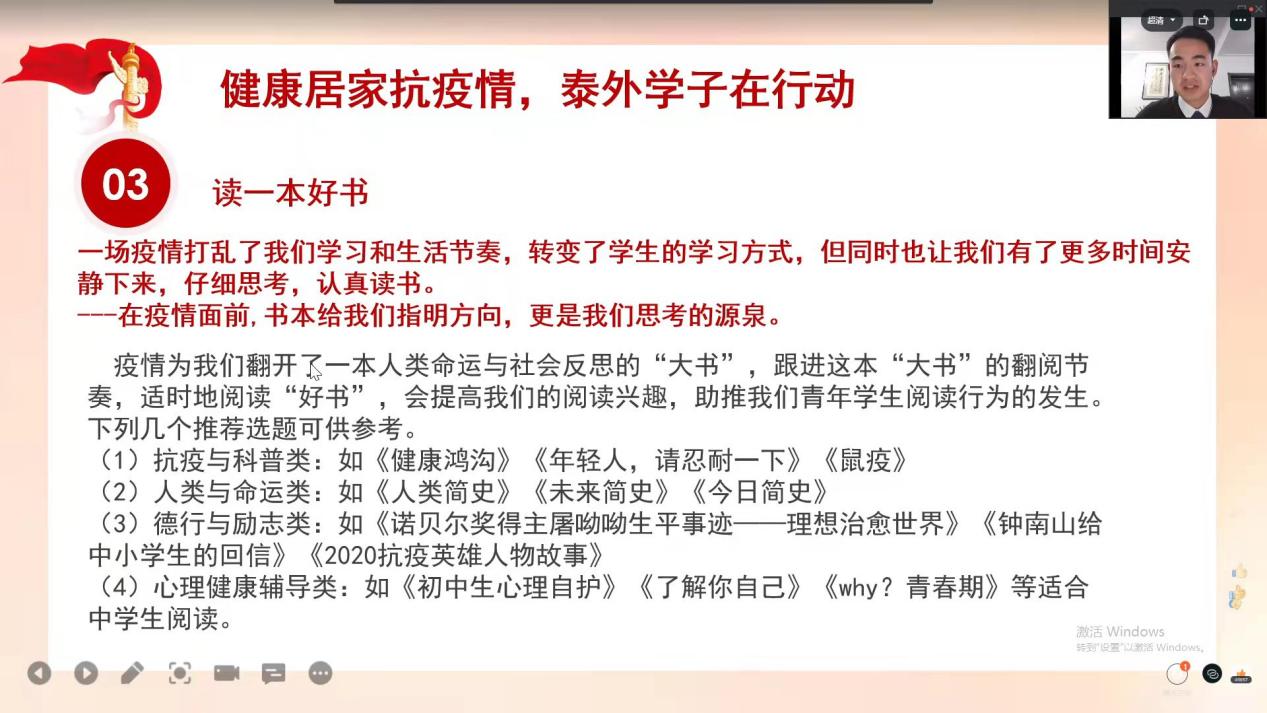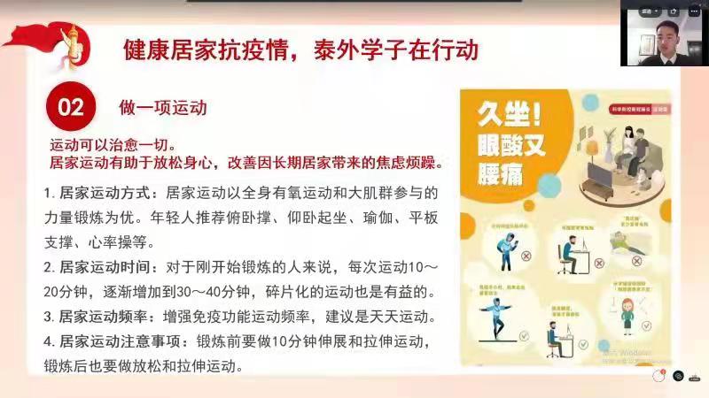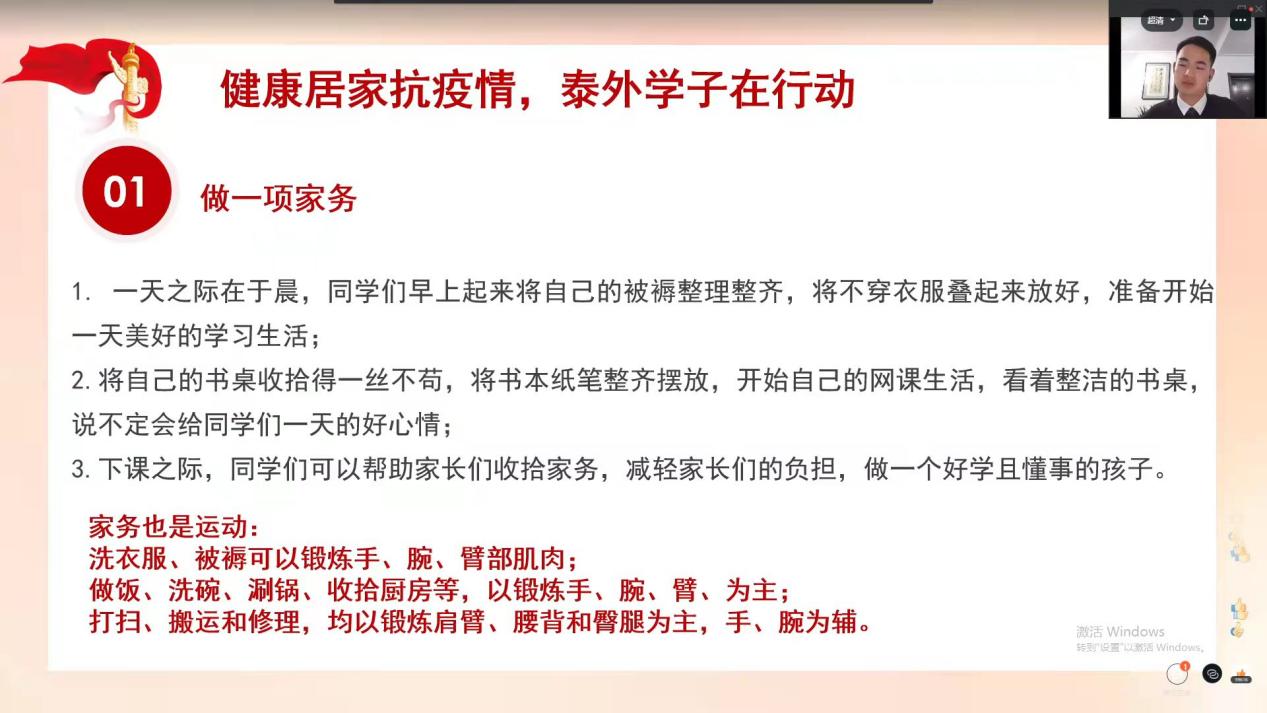 最后,于帥老師圍繞“健康居家抗疫情,泰外學(xué)子在行動(dòng)”的主題號(hào)召同學(xué)們積極參與勞動(dòng)、不斷充實(shí)生活,提升自我,做一項(xiàng)家務(wù),做一項(xiàng)運(yùn)動(dòng),讀一本好書……