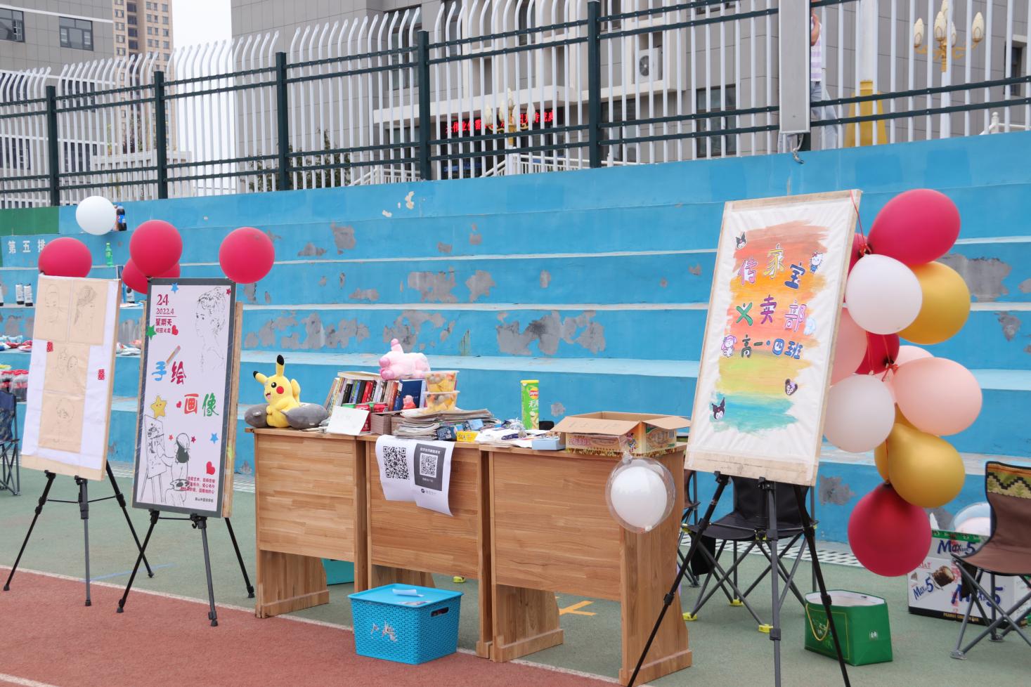 同學(xué)們精心布置各班的特色攤位。