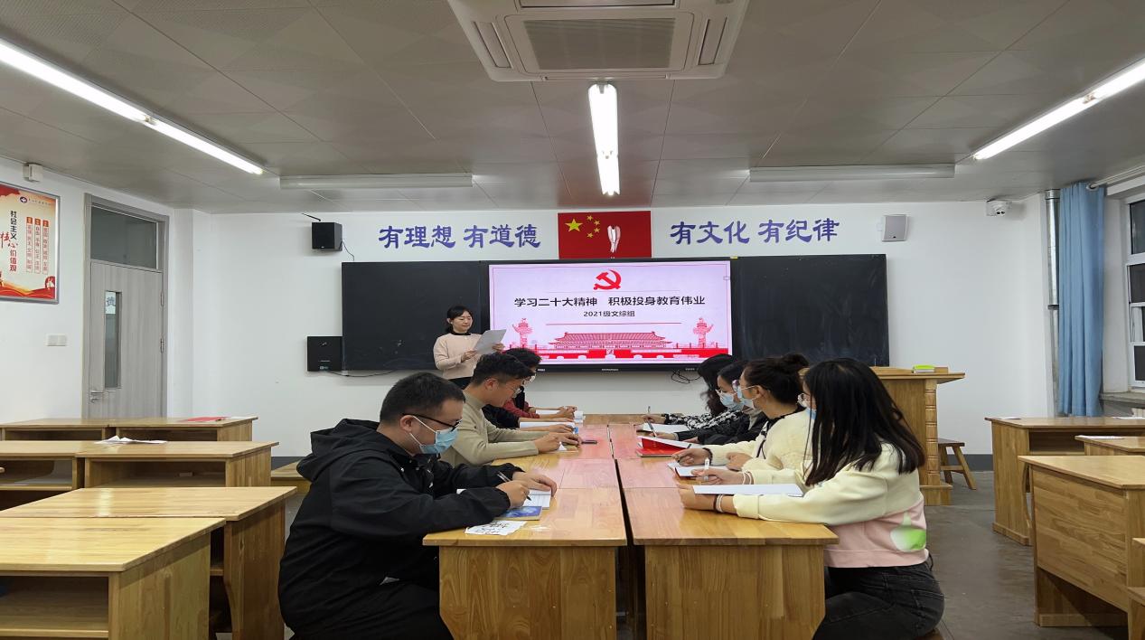 “黨的二十大報告為推進文化自信自強,鑄就社會主義文化新輝煌指明了方向。作為基層教師,我們將時刻牢記為黨育人、為國育才的使命,不忘初心,腳踏實地,不斷加強對黨的二十大精神的學習領會,堅定不移抓好貫徹落實,在自己的崗位上踏實工作、勇于創(chuàng)新,為辦好人民滿意的教育貢獻力量!” ——外語組