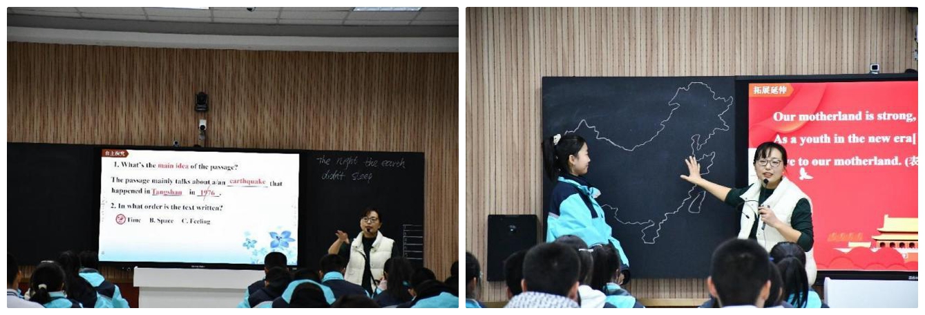 趙偉老師講授的是《The night the earth didn't sleep》。趙老師從唐山大地震引入本課內(nèi)容,緊扣Skeleton策略進(jìn)行教學(xué),從文本解構(gòu)——文本建構(gòu)——文本重構(gòu)——文本創(chuàng)構(gòu)層層遞進(jìn)地創(chuàng)設(shè)了一系列活動(dòng),學(xué)生興趣濃厚,小組合作環(huán)節(jié)全員參與,充分體現(xiàn)“以學(xué)生為中心”的課堂,最終在學(xué)生對(duì)祖國(guó)的美好祝愿中得到升華。