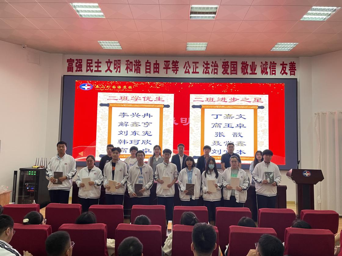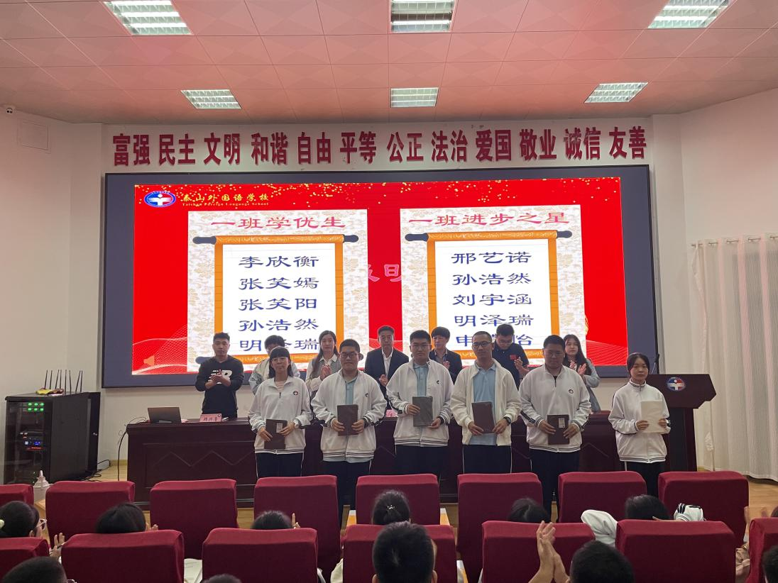 教學主任孟鳳宣讀表彰年級前十名和年級單科第一名的同學,德育主任張科濤對各班前五名及進步之星進行表揚。在激昂的進行曲的伴隨之下,意氣風發(fā)的少年,初出茅廬,腳底生風,翼展騰飛,分批次上臺領獎、合影,留下最美好的一瞬間。