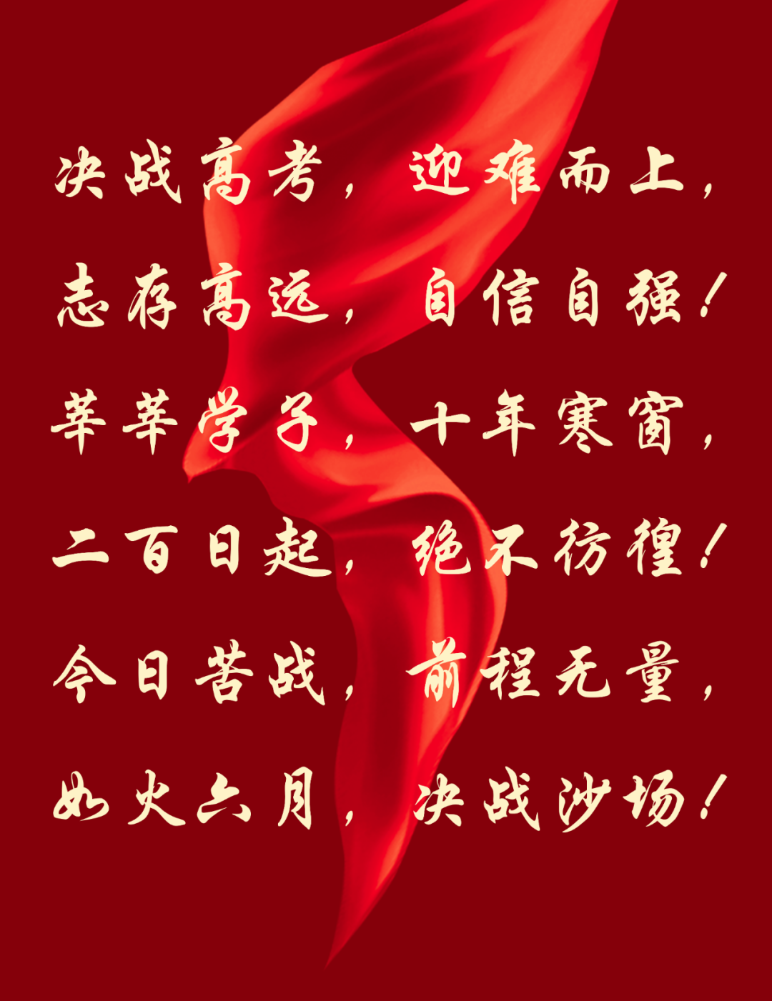 十二載苦學(xué)終不負(fù),二百天磨劍待開(kāi)鋒!拔蛞酝恢G,知來(lái)者之可追”,沖鋒的號(hào)角已經(jīng)吹響,珍惜200天,奮斗200天,用青春汗水澆灌沉甸甸的夢(mèng)想,圓夢(mèng)高考,去上好大學(xué),去見(jiàn)更精彩的世界,以優(yōu)異的成績(jī)回報(bào)父母與老師!