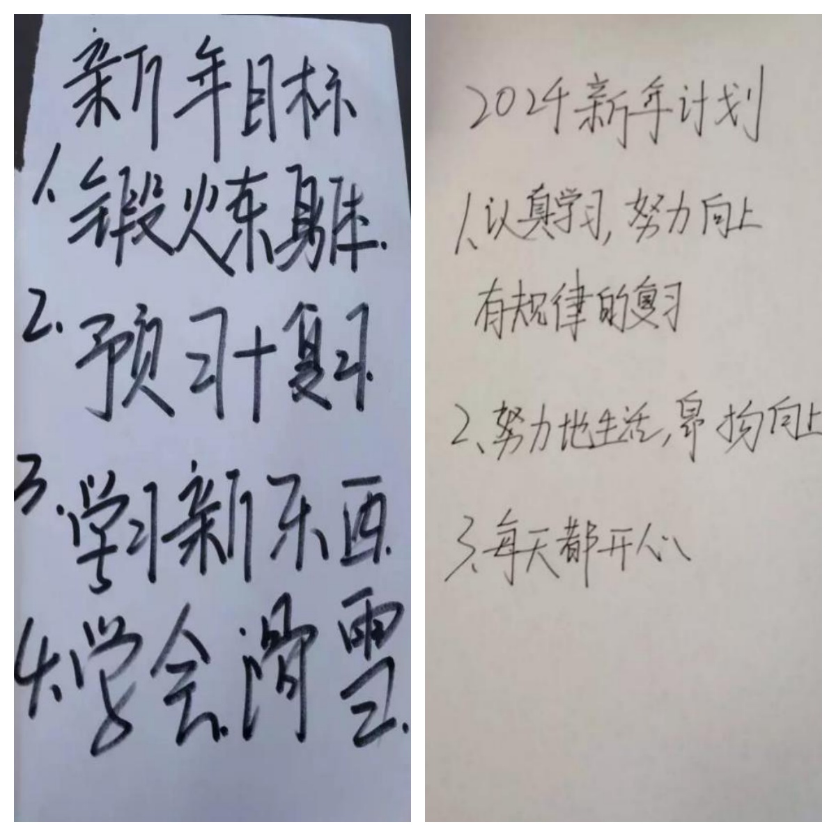 新年伊始,學(xué)生們回顧2023,展望2024,制定了新一年的學(xué)習(xí)復(fù)習(xí)計(jì)劃!俺煽兏M(jìn)一步”“多刷題,多詢問”“進(jìn)入培優(yōu)班”“好好復(fù)習(xí)!備戰(zhàn)期末!”··· ···字字句句,閃閃發(fā)光,寄寓著學(xué)生們的美好期望。