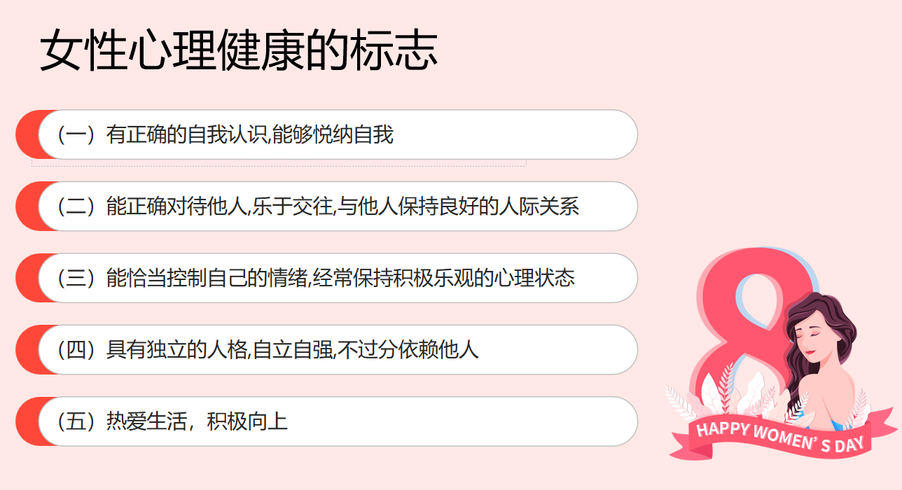 最后,就女性心理健康,賈主任講解了女性心理健康的標(biāo)志,如何真正做到愛自己,面對生活中的種種壓力,應(yīng)該做到以下幾點(diǎn):多曬太陽;做好各種計劃;多運(yùn)動;保持閱讀;看淡他人。