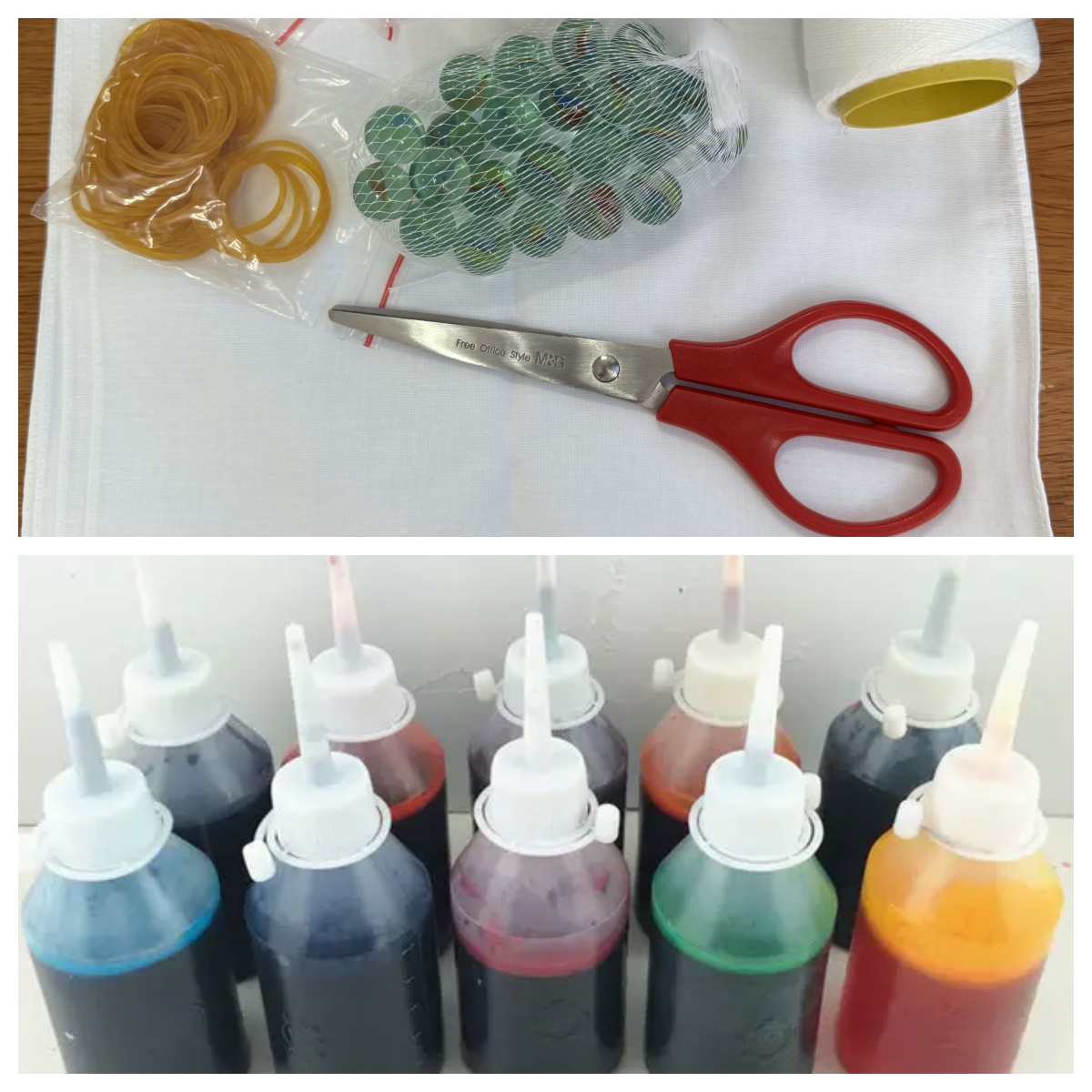 棉布一塊、橡膠圈若干、玻璃彈珠若干、棉線、雪糕棒或一次性筷子若干、夾子若干、染料、固色劑、剪刀