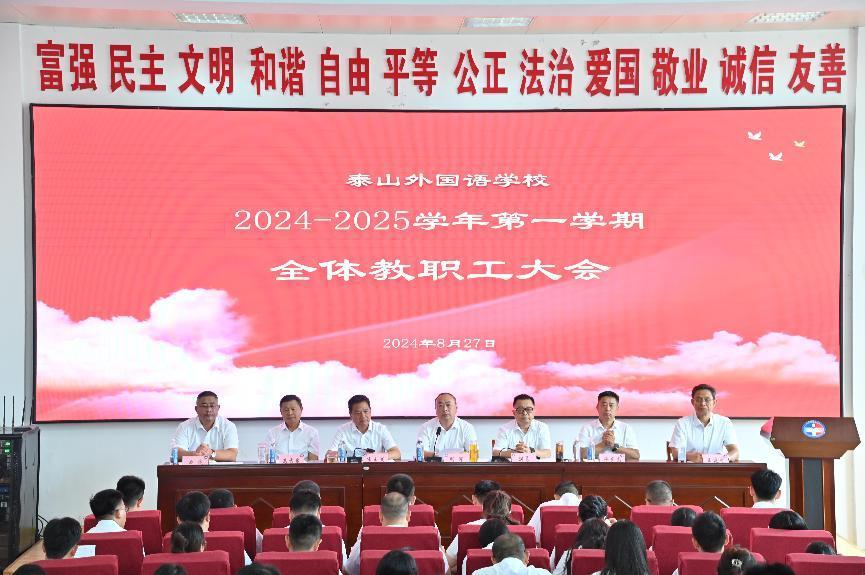 秋高氣爽,風(fēng)和日麗,在這個(gè)收獲的美好時(shí)節(jié),泰山外國語學(xué)校全體教職工迎來了新的學(xué)期。為統(tǒng)一思想,明確目標(biāo),凝聚共識,續(xù)寫輝煌,8月27日上午9:00,學(xué)校在崇遠(yuǎn)樓一樓階梯報(bào)告廳隆重召開了2024-2025學(xué)年第一學(xué)期全體教職工大會。會議由宋玉成同志主持。