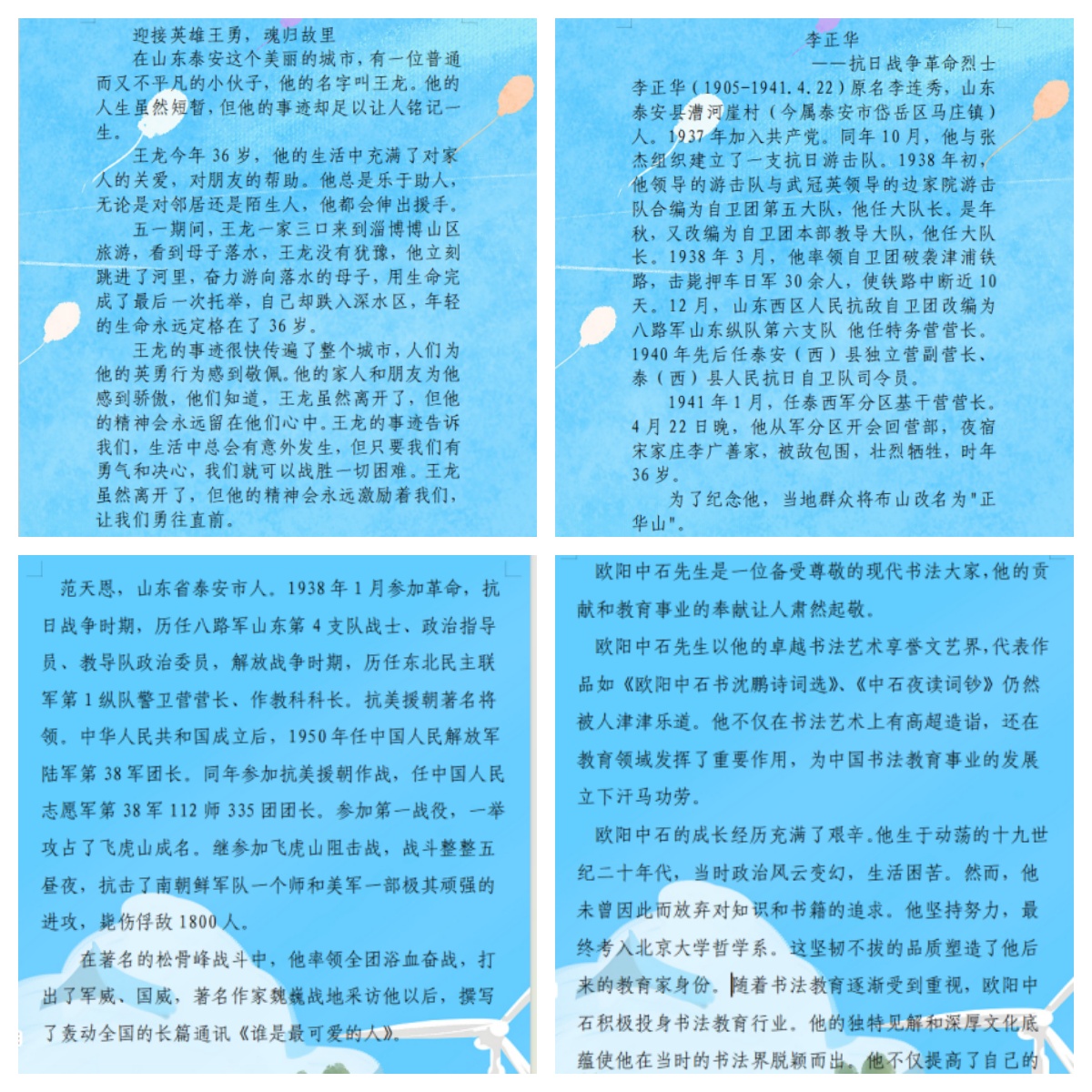 隨著年齡的增長(zhǎng),學(xué)生們或許會(huì)因?yàn)榍髮W(xué)、工作等原因離開(kāi)家鄉(xiāng),但那份鄉(xiāng)情卻如同一條無(wú)形的線,緊緊地將學(xué)生與家鄉(xiāng)相連。趁著學(xué)生們還未離開(kāi)家鄉(xiāng),學(xué)校要求學(xué)生搜集泰安本地的名人事跡,寫成一部故事集,來(lái)增加對(duì)家鄉(xiāng)的認(rèn)識(shí),增添對(duì)家鄉(xiāng)的依戀。以下是學(xué)生的優(yōu)秀作品: