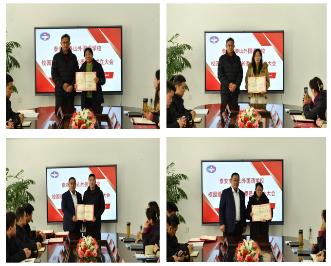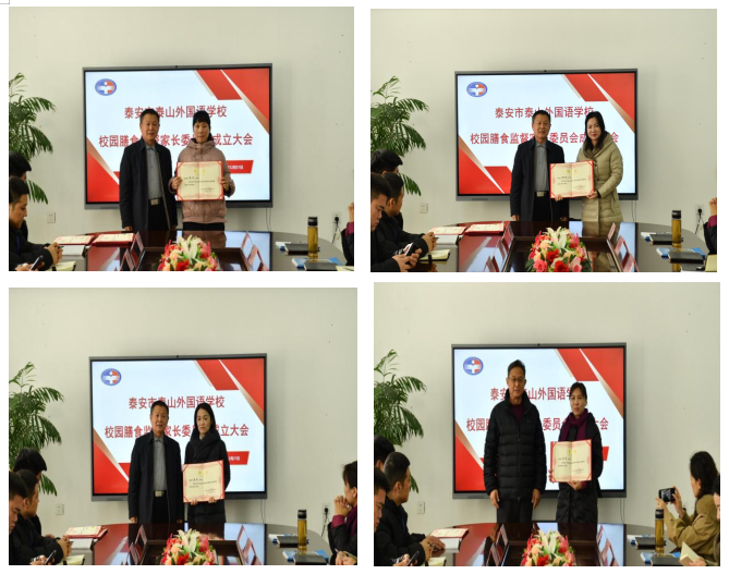 學(xué)校副校長(zhǎng)高秀泉、王建中、曲斌為校園膳食監(jiān)督家長(zhǎng)委員會(huì)成員頒發(fā)了聘書(shū)。