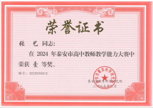 近日,泰安市教育科學研究院公布了2024年全市高中教師教學能力大賽獲獎名單。本次大賽以“全員練兵、強基賦能”為目標,通過“真題解題、真題析題、給定材料命題”的考試形式,全面檢驗教師的學科專業(yè)素養(yǎng)與命題實踐能力。我校積極響應(yīng)“全體教師參賽”要求,組織全校教師全員參與、全程備賽,最終斬獲一等獎1項、二等獎4項的優(yōu)異成績,張藝老師榮獲一等獎,李坤城、孫曼曼、楊宏旸、趙成松4位老師榮獲二等獎,充分展現(xiàn)了我校教師隊伍的整體實力與拼搏精神!
