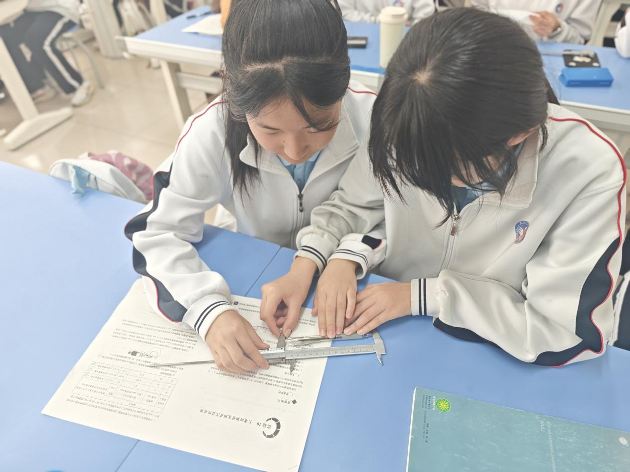 趙老師穿梭于各組間,及時糾正操作細(xì)節(jié):“注意游標(biāo)卡尺的量爪需垂直被測物體表面,螺旋測微器的半毫米刻度是否露出!”