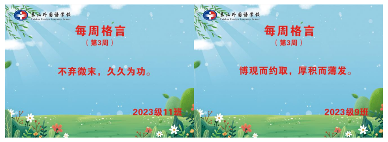 “一言可明志,一句見乾坤!睘樯罨掠䴘櫴浇逃,本學(xué)期2023級部創(chuàng)新推出“每周格言”品牌活動,通過精選古今中外經(jīng)典名言,以“每周一貼、每周一思”的形式,讓思想的力量悄然滲透學(xué)生日常,在潛移默化中涵養(yǎng)品格、塑造價值觀。