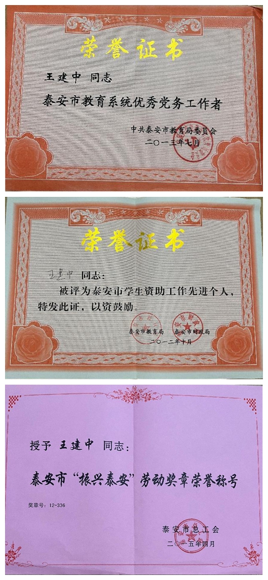 王建中,中共黨員,中學(xué)高級教師,泰山名師,泰安市優(yōu)秀教師、泰安市教學(xué)能手、泰安市市直系統(tǒng)優(yōu)秀教育工作者、泰安市教育系統(tǒng)優(yōu)秀黨務(wù)工作者、泰安市學(xué)生資助工作先進(jìn)個(gè)人、“振興泰安”勞動(dòng)獎(jiǎng)?wù)芦@得者。