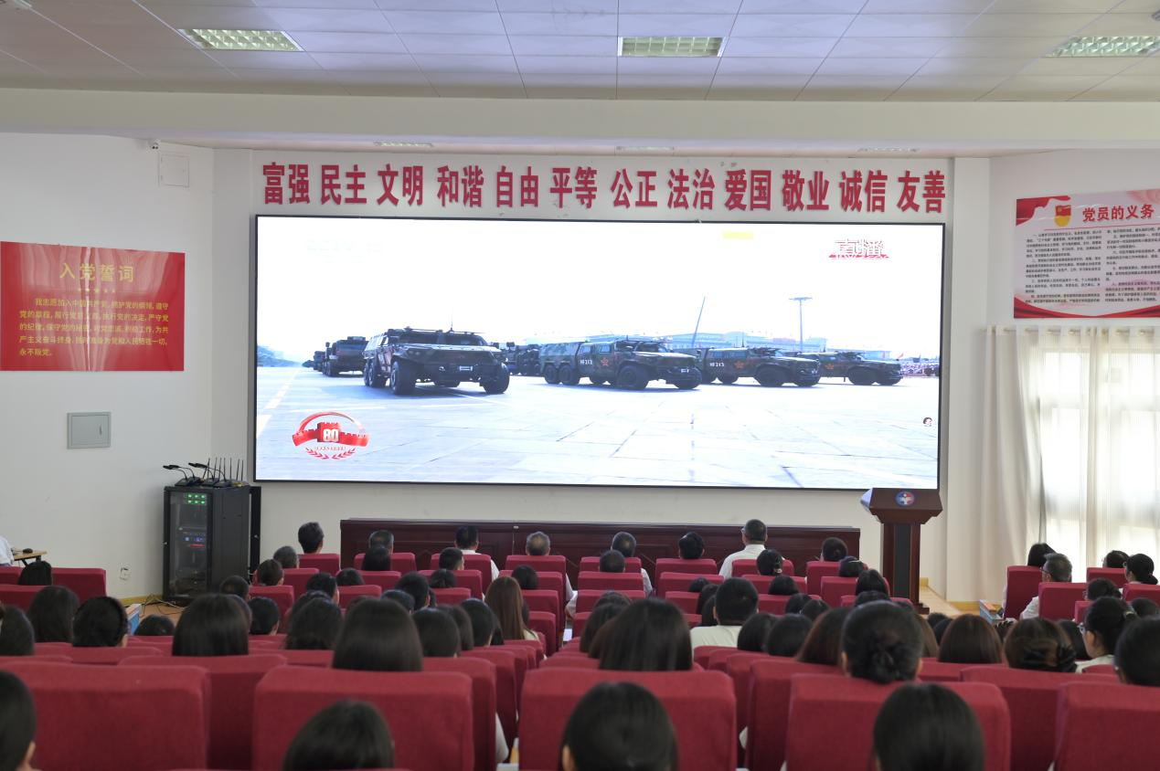 9月3日上午9時在首都天安門舉行盛大的閱兵式,泰山外國語學校組織全體教職工在崇仁樓一樓報告廳觀看現(xiàn)場直播,各年級組織學生在教室同步觀看現(xiàn)場直播。